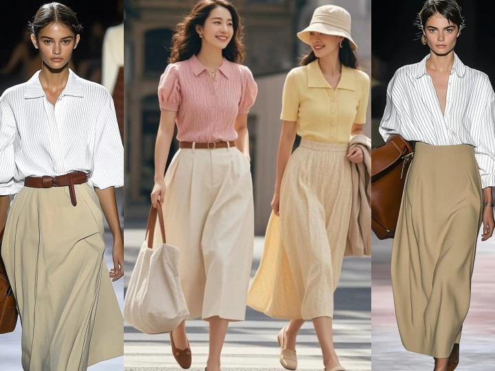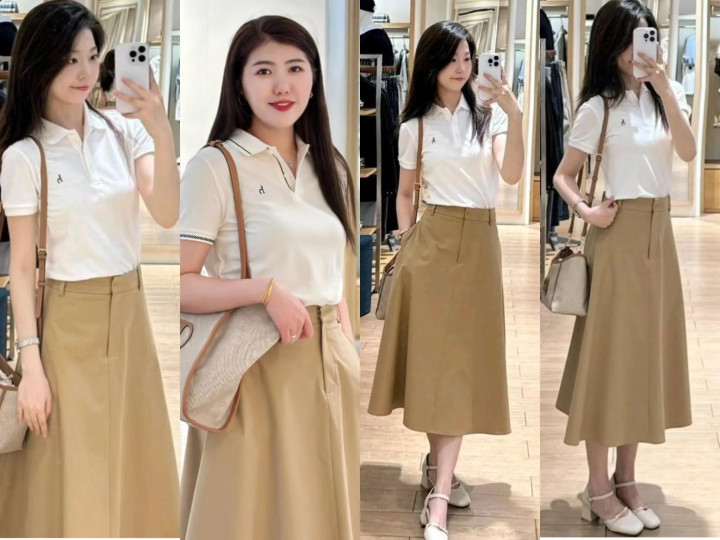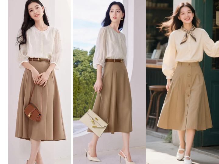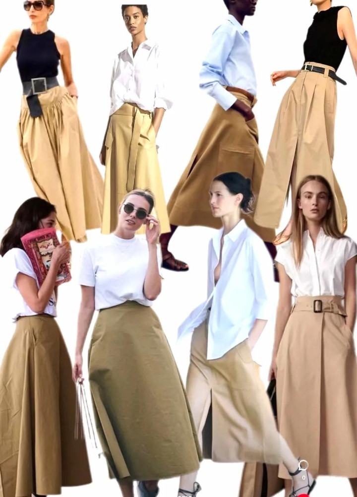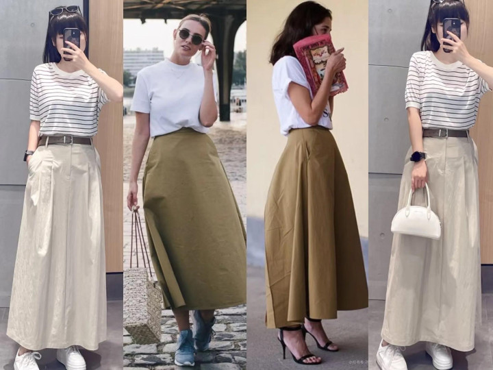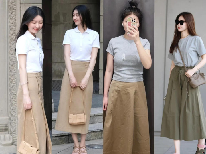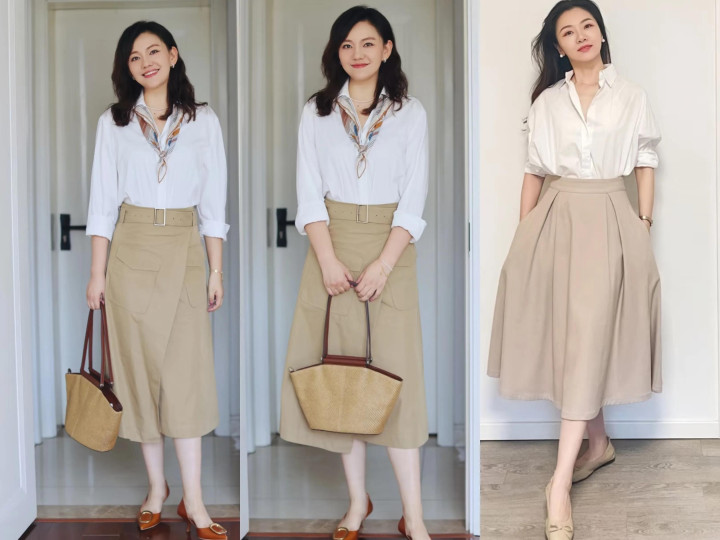 选择白色/米色上衣和卡其色半裙搭配,造型简约高级且不出错。比如白衬衫+卡其色A版裙,低调优雅又显气质,秋季氛围感满满。