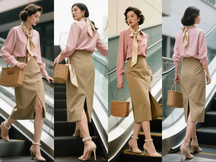 要是你身材匀称,还可以穿上粉色真丝衬衫,搭配卡其色直筒开衩半裙,裸色高跟鞋进一步拉长腿部线条。脖子上肤色印花丝巾,与鞋子形成上下呼应,整体优雅复古又高级。