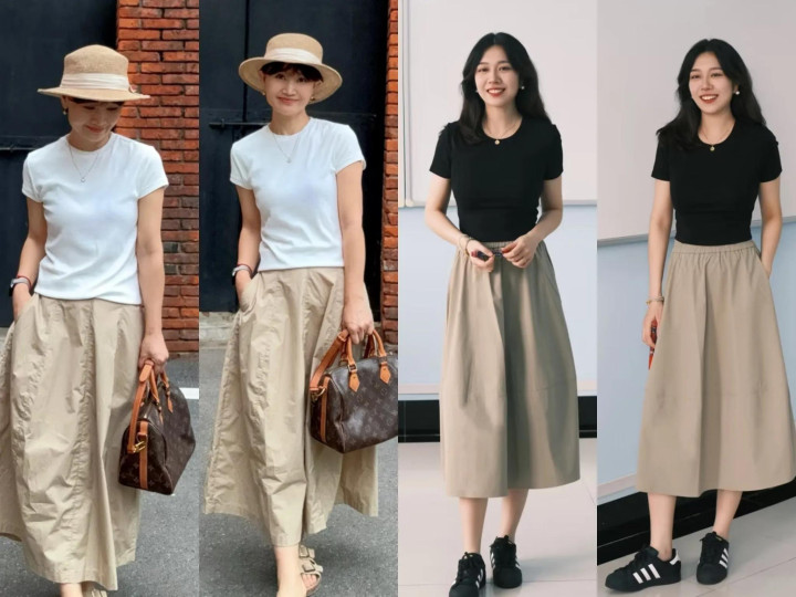 卡其色半裙有不同款式,比如直筒、A版、伞裙等。如果你是属于胯宽腿粗的梨型身材,高腰A版裙是首选。搭配合体针织衫或polo衫,轻松穿出遮肉显瘦又有氛围感造型。