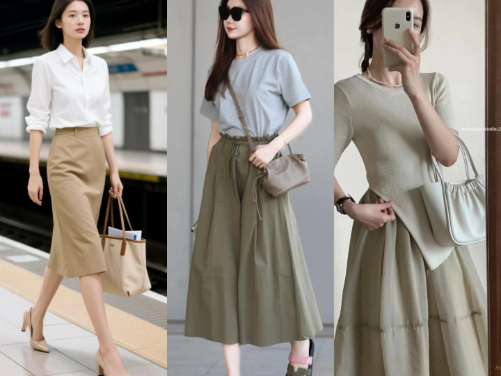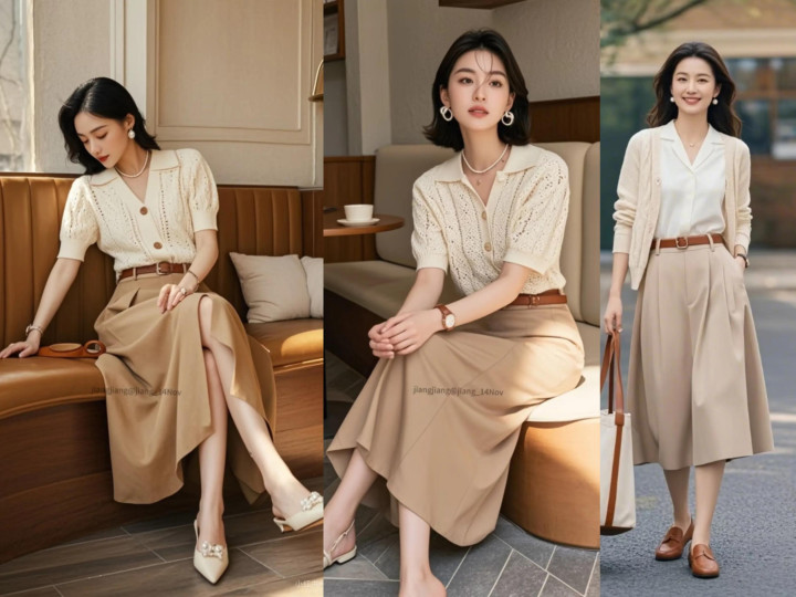要是选择蓝色或绿色上衣,与卡其色半裙进行对比色组合,整体呈现出层次分明又吸睛造型,让你的秋季穿搭,充满个性与时髦感。