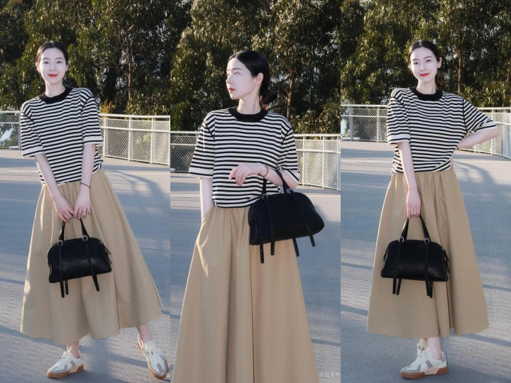 如果你只有一件条纹T恤,也可以拿来和卡其色半裙搭配。选择一双和半裙颜色和谐的德训鞋,以及和上衣元素有呼应的包包,穿出复古时髦不失休闲造型。