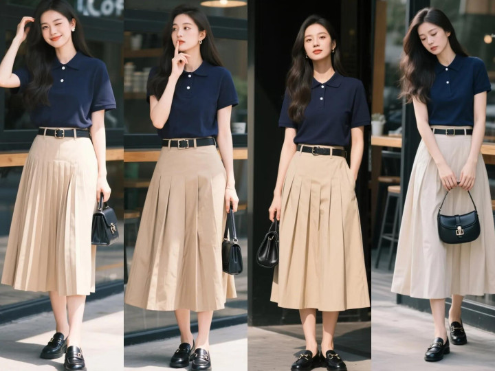 个性时尚的女性,还可以选择藏蓝色Polo衫,与卡其色百褶半裙进行对比组合。黑色皮带强调出腰线和比例,乐福鞋和包包与皮带颜色统一,造型充满优雅高级老钱风。