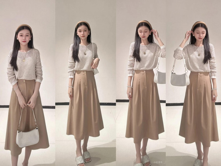 要是你有一件套头镂空针织衫,可以内搭吊带背心,再搭配卡其色A版半裙。衣摆塞进裙腰,凸显出腰线,选择与上衣颜色一致的包包和鞋子呼应,整体优雅又简约。