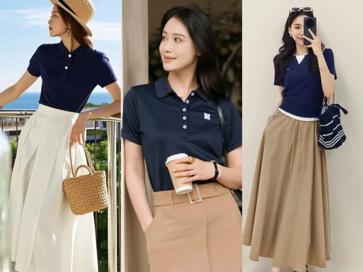 polo衫,款式经典简约,自带学院风和休闲感,穿上有一种复古老钱风味道。早秋季节,选择和卡其色半裙搭配,好看又显气质,轻松穿出氛围感拉满造型。